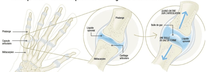 Les surfaces articulaires s'écartent, le liquide synoviale (liquide lubrifiant de l'articulation) s'étire, la pression chute = création d'une bulle qui va se dissoudre très peu de temps après avoir été crée en "craquant" = cavitation.